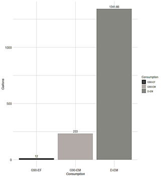 The UNJ consumed a total of 1,341.66 gallons of diesel (D-EM) fuel and 233 gallons of gasoline for its mobile equipment (G90-EM), while the consumption per fixed equipment was 12 gallons of gasoline (G90-EF) as shown in Fig 2. The low consumption of diesel fuel is due to the fact that the university only used diesel fuel for the use of two motorcycles, which were used for short trips.