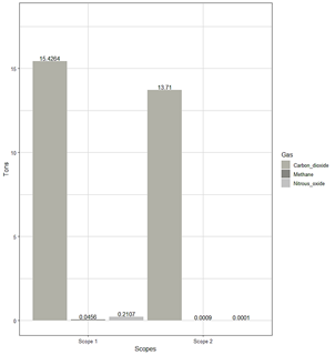 Scope 1 emitted 15.4264 tCO2, 0.0456 tCH4 and 0.2107 tN2O and scope 2: 29.1364, 0.0464 and 0.2108 t for CO2, CH4, N2O (Fig. 4).