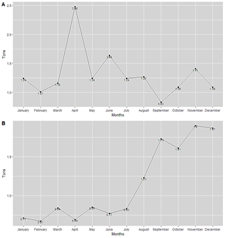 Fig. 5 shows the comparison of total monthly CO2eq emissions by scope, where scope 1 (Fig. 5 A) showed that fuel consumption in April produced 2.4792 CO2eq, the highest value, and September the lowest with 0.8301 CO2eq. Meanwhile, in scope 2 (Fig. 5 A), for energy consumption, November and February were the months that generated the most and least tCO2eq, respectively.