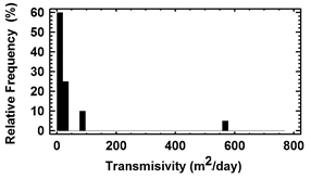 Table 5 presents the results of the calibration of the transmissivity models (𝑇) in the pumping well from a confined aquifer. The adjustment parameter in Eq. 4 is (u), which takes a mean value of 1050.64. The value of u could be found in an interval with a confidence level of 95%, whose lower and upper limits range from 664.32 to 1436.94. In the interval estimation of the parameter 𝑢, the standard error of the statistic and the length of the confidence interval are small in relation with the mean magnitude of the parameter and the assumed confidence level, which indicates that there is adequate precision or quality of the information for the estimation of the response variable, represented by the transmissivity using Eq.4 41-42.