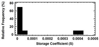 Regarding the geophysical parameters, the effective porosity varied in agreement with that for unconsolidated sediments 40. The San Diego aquifer includes alternating layers of soil material predominantly between well graded sand and low plasticity clay, being a confined aquifer. Gravel is the only aquifer material in the three profiles near the mountainous area identified as: P25, P26 and P27 where the recharge zones could be located. The effective porosity corresponded to a coarse-grained soil material 40. According to 40, the water-filled pore space cannot be completely drained by pumping or evaporation, a fraction of the water binds to the surface of the mineral grain by adhesion. The drainable pore space defines the effective porosity. The amount of bound water is strictly related to the internal surface of the pore space. Material with a small grain size has a high internal surface area, for example, clay up to 100 m2/g compared to silt (approximately 1 m2/g) and sand (approximately 0.1 m2/g). A large amount of bound water reduces the effective porosity. Therefore, despite the high porosity of clay, the effective porosity of clay is very small. Typical values of effective porosity are: clay <5%, fine sand 10-20%, coarse sand 15-30%. For aquifers that are classified as composed of coarse material, the effective porosity is only slightly smaller than the total porosity. As can be seen, the San Diego aquifer has a porous space that gives it a high capacity to be drained.