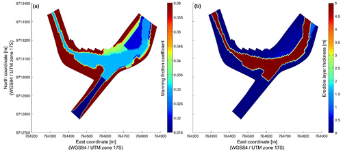 Figure 5: Manning Friction Coefficient (a) and Erodible Layer Thickness (b) definitions in the numerical model of the Mazar Stilling Basin.