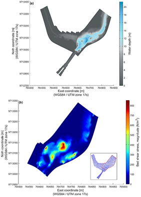 For the morphological updating, we defined a uniform bed layer with one sediment fraction according to the information available. The thickness definition of the total sediment layer in the spatial domain is non-uniformly distributed (Fig. 5(b)), considering zones in which bed erosion can be neglected (e.g., in the spillway) and zones with a great erodible thickness (e.g., in the river center bed). The spatial distribution of erodible thicknesses (Fig. 5(b)) was obtained from the exploration campaign with mechanical (direct exploration) and geophysical (indirect exploration) tests.