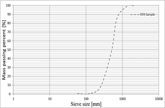 For the study, an asphalt cement classified by viscosity as CA-30 and recycled tire rubber powder (RTR, Fig. 1) is used as asphalt modifier. The RTR is added to the asphalt in percentages of 15 %, 20 % and 25 %, according to the particle size of the sample as can be seen in Fig. 2. The modification of the asphalts is carried out in a high-speed disperser for one hour to obtain a homogeneous sample. Base asphalt and RTR-modified asphalts are subjected to a thin-film oven (RTFO) to simulate the short-term aging conditions that occur in asphalt. Asphalts are characterized by rotational viscosity, torsional elastic recovery and softening point tests before and after aging the samples.