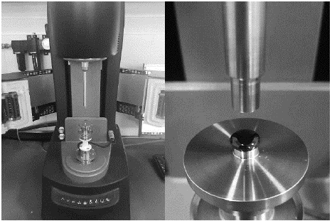 Figure 3: Dynamic shear rheometer (left), 8 mm geometry with the sample (right)