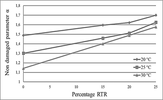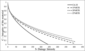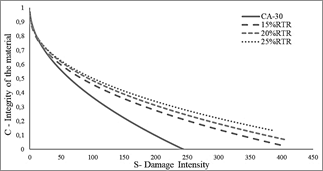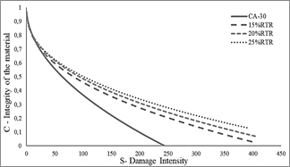 With the adjustment parameters found, the C-S curves of material integrity are plotted as a function of the accumulated damage. Figs. 5-7 show the curves for 20 °C, 25 °C and 30 °C, respectively. For the three temperatures, it can be seen in the graphs that the asphalts modified with RTR maintain a greater integrity of the material for damage intensities greater than 50. In the same way, a superior performance is evidenced when the percentage of incorporation of RTR increases, although in a less pronounced. It can also be shown that the asphalts with RTR have a 60 % material life based on the damage intensity limit value for the unmodified asphalt, for the evaluations at 20 °C.