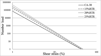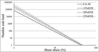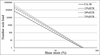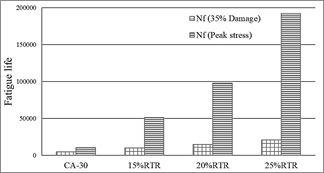 From the developed C-S graphs, the models are assembled to estimate the fatigue life based on the maximum specific deformation of the material and the failure criterion adopted for its evaluation. In the first instance, these curves are evaluated with the 35 % reduction of the initial integrity to develop the model seen in eq. (1). As can be seen, in principle, for 20 °C there is a considerable benefit from the incorporation of RTR as shown. see in Figs. 8-10.