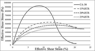 As can be seen in Fig. 12, despite obtaining a higher peak stress, the CA-30 sample reaches this value prematurely and falls sharply compared to asphalts with RTR. The modified asphalts show a more stable curve as the percentage of RTR increases. Said effect is contemplated in the C-S curves that evaluate the internal work carried out by the material. On the other hand, the displacement of the stress peaks in the samples translates into large displacements in the C-S curves. Finally, this has a considerable effect when evaluating the number of axes considered to be fatigued.