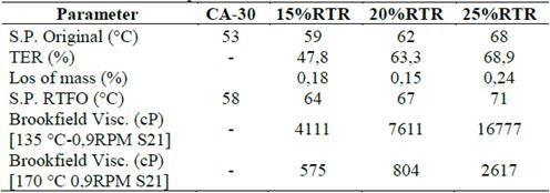 The asphalt binders used are a conventional asphalt classified by viscosity (CA-30) and three binders modified from the base asphalt with increasing rates of rubber from RTR (15%RTR, 20%RTR and 25%RTR). Table 1 shows the properties of the asphalts used.