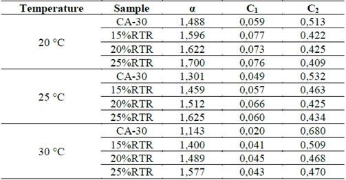 After aging the asphalts in the RTFO, the LAS test is carried out in the DSR. Through the previously performed analysis, the parameters of the model are calculated according to the S-VECD to evaluate the coefficient α of integrity of the material and the coefficients C1 and C2 of the damage curve. Table 2 shows the tests at 20 °C, 25 °C and 30 °C below.