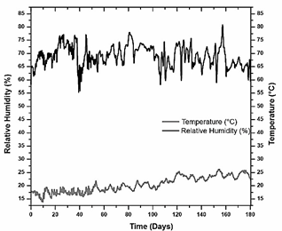 Relative humidity and temperature over time, registered in the laboratory where the indoor experiment was undertaken, are shown in Fig. 2. Temperature and relative humidity varied between 13 °C - 26 °C and 51 % - 84 %, respectively. Temperature exhibited an increasing trend, in accordance with the seasonal weather change (from winter to summer), showing a rise of 13 °C along180 days. Relative humidity mean values did not show significant variations within the frame of the experiment (Table 1).