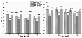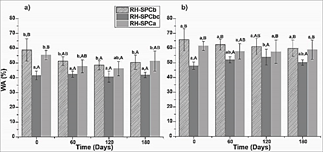 Figs. 3 and 4 display the evolution of thickness swelling (TS) and water absorption (WA) of the boards, respectively, with time. Uncoated boards (RH-SPCb and RH-SPCa) exhibited similar TS and WA values at 2 and 24 h. Contrarily, RH-SPCbc registered the lowest TS and WA values (p < 0.05) at 2 h and 24 h. The coating applied over the surface of the particleboards restricts the possibility of water molecules to diffuse inside the core of the panels, limiting TS and WA. Our results agreed well with those reported by Nemli et al., [37], who found that surface coating improved the TS of panel. The TS and WA of RH-SPCb, RH-SPCbc and RH-SPCa were lower than those reported in the literature, such as Li et al., [5] and Jonoobi et al., [41], who measured TS and WA in composites from rice straws and sugarcane bagasse, respectively, both bonded with urea-formaldehyde resin (UF). Moreover, TS and WA of RH-SPCbc at 24 h of immersion were competitive with those reported by Leiva et al., [11], for boards elaborated with rice husk and UF adhesive, and with those reported by Kwon et al., [13], for rice husk boards using phenol-formaldehyde as binder.