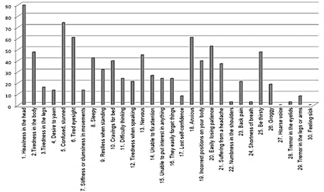 The 12 people in the sample group manifested the presence of subjective feelings of fatigue, highlighting both physical and mental fatigue. Fig 3 summarizes the symptoms presented during or after the end of the working day of the sample group, highlighting the heaviness in the head, fatigue in the legs, confusion, lightheadedness and back pain.