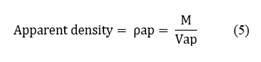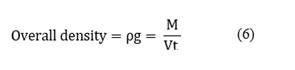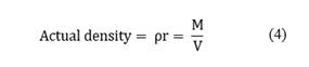 The open pores can become permeable or impermeable, which means communicated or not communicated. Due to the previous expressions and considering the definition of density (Mass/Volume) three types of densities can be defined (Depending on why the volume is divided); thus, Eq. 4 was used, and as considerations, Eq. 5 and Eq. 6. It is important to remember that the last two densities in compact materials could differ by 2.0%.