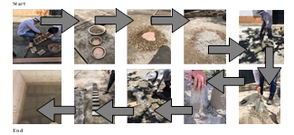 For the elaboration of the cobbles considering the mixture design, the steps shown in Fig. 2 were considered. The first thing that was carried out was to thoroughly clean the surface where it was going to be done so that it did not have contact with any other material or solid residue and thus obtain an optimal elaboration of this, then proceed to stir the materials together so that the clay and ash are well dispersed. Finally, add water and stir until it is completely compacted. After having all the mixture stirred according to the type of dosage, the slump cone test is carried out, which involves filling a frustoconical metal mold with standardized dimensions, in three layers rammed with 25 strokes of the rod. This removes the mold, and the settlement experienced in the upper part of the concrete mass is measured, to verify the settlement between 5 and 10 cm. Subsequently, the concrete is poured over the molds, making it into two layers, each layer rammed with a metal rod 25 times, ensuring that the mixture is well compacted and avoids gaps between it.