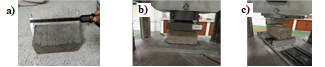 Figure 3: a) Morphology, b) compression test, and c) bending test on cobbles.