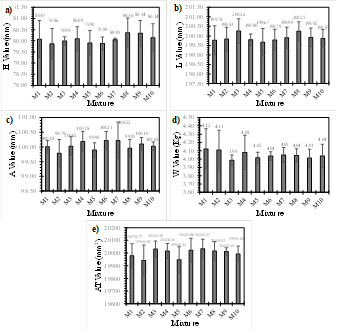 Fig. 4a shows the height values for all the mixtures evaluated, obtaining an average value of ~80 mm, with a maximum and minimum value of 80.36 and 79.86 mm, respectively. In the case of length dimensions, the results are shown in Fig. 4b, where an average value of ~199 mm in length can be seen in general, with a maximum and minimum value of 199.78 and 200.26 mm, respectively.
