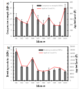 Figure 5: Results of a) Compressive strength and b) Breaking modulus versus the applied load for all the mixtures.
