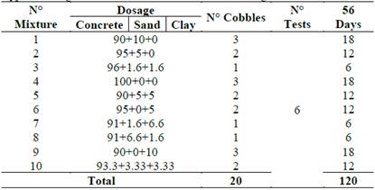 According to the experimental data obtained for the physical characterization of the aggregates, a maximum resistance of 21 MPa is expected, with a settlement of 5 cm, since this settlement is recommended for hand-vibrated concrete and pavements, establishes a dosage of 1:2:3, this being a national standard for cobbles. Therefore, the corresponding dosages for the different cobbles are calculated after determining the main dosage, as shown in Table 3. This way, a total amount of 120 cobbles were obtained considering the experimental design (Multiplication between cobble amount and number of tests) to develop the tests based on NTC standard procedures and then obtain the main mechanical properties of the cobbles with different dosages.
