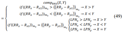 To simplify the comparison function in RNS, the subtraction of RRs with their corresponding R 2 residues is carried out in modulo m2 to ensure positive values. In terms of hardware implementation, if LPNs and RRs are obtained from a memory-based LUT, the comparison function can be calculated solely using the LUTs and the residues from X and Y. This approach overcomes the main challenge in RNS, which is the conversion from RNS to Binary using methods such as the Chinese Remainder Theorem. The comparison function can be defined as follows: