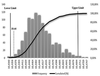 Based on the probability distributions and the mathematical model, 1,000 simulation runs were performed. Fig. 2 displays parameters such as frequency, run frequency accumulation, risk value, and confidence percentage to determine the effectiveness of the output characteristic.