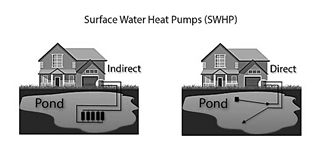 Surface Water Heat Pumps: these systems require much lower upfront costs than the previous ones, since no type of drilling or excavation is needed to access the heat exchanging medium. It can use a direct or indirect heat exchanger (as shown in Fig. 5) in superficial bodies of water such as rivers, ponds, or lakes, with enough volume and depth to ensure constant temperatures at the bottom.