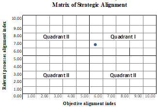 To build the Strategic Alignment Matrix, the Ipr” was calculated, whose value was 6,46 (Table 8), showing that the Rp” are acceptably aligned with the SO defined for the sport organization. After determining the alignment indexes, the Strategic Alignment Matrix is constructed as shown in Fig. 2.
