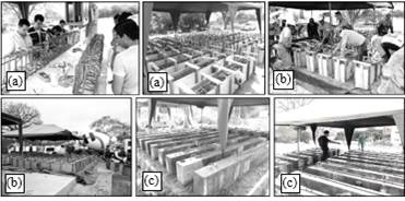 Figura 2: Fabricación de los especímenes de ensayo. (a) Armado e instrumentación interna (strain gauge) (b) Hormigonado y vibrado. (c) Curado.