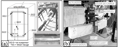 Los desplazamientos se registran mediante dos LVDT de 2 micras de precisión colocados en el centro de la luz bajo el nudo. La fuerza aplicada por el actuador se registró mediante una celda de carga de 1 kg de precisión; se fabricó un sistema de utillaje para para crear condiciones de borde de una viga simplemente apoyada, mostrados en la Fig. 3(b). Las deformaciones en las barras de acero se registraron por medio de 6 strain gauges colocados en los puntos mostrados en la Fig. 3(a).