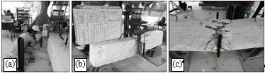 Figura 4: Registro de datos. (a) Equipo Datalog 8 y marcado de espécimen. (b) Pizarra para el registro de carga con el avance de fisuras. (c) Viga llevada hasta el fallo.