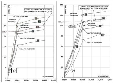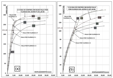 En la Fig. 8(a) se confrontan las curvas carga - desplazamiento de los experimentos E1, E3, E5 y E7 (M / V = 0,85) con la curva de la viga de control (E9) de igual relación M / V; por su parte, en la Fig. 8(b) se contrastan las curvas carga - desplazamiento de los experimentos E2, E4, E6 y E8 (M / V = 1,70) con la curva de la viga de control (E10) de igual relación M/V.