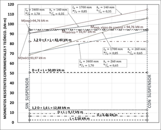 Por el contrario, la utilización de estribos suspensores conduce a valores del momento resistente experimental promedio, similares o superiores al momento resistente experimental promedio de las vigas de control y al momento resistente teórico, lo que alcanza un valor máximo del orden de un 22 % en especímenes con hc/h = 0,35 M/V = 0,85 y m,