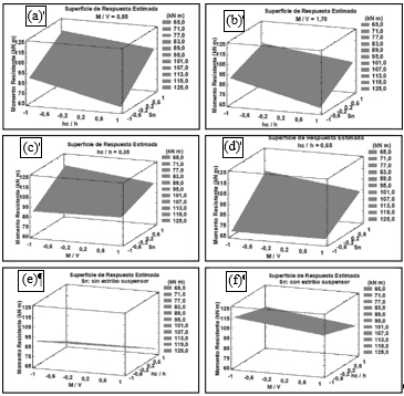 Figura 14: Superficies de respuesta para momento resistente. (a) Para M / V = 0,85 m. (b) Para M / V = 1,70 m. (c) Para hc/h=0,35. (d) Para hc/h=0,65. (e) Para Sn= sin estribos suspensores. (f) para Sn con estribos suspensores.