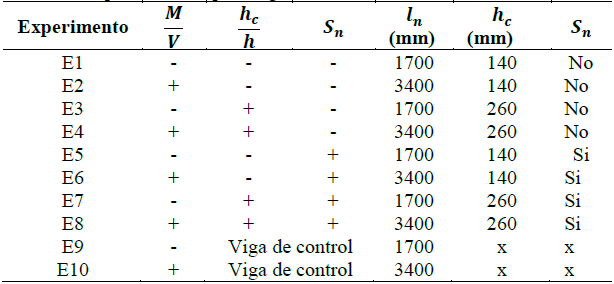 Tabla 1: Matriz de experimento 23 para vigas con nudos híbridos.