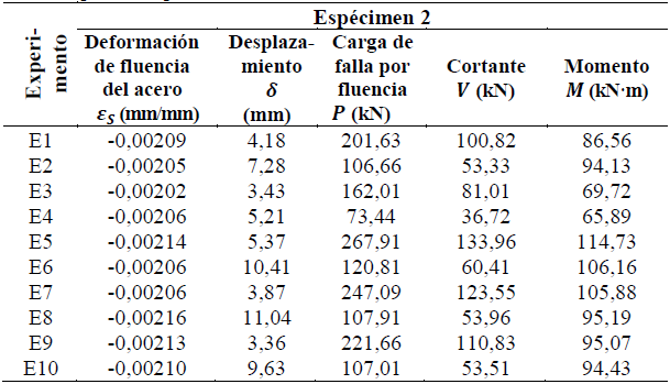 Tabla 3: Resultados experimentales para el fallo primario por fluencia del acero a tracción para el espécimen 2.