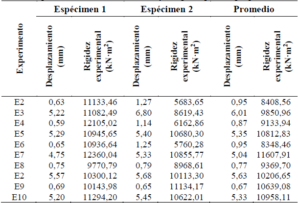 La Tabla 4 contiene los valores experimentales de las deflexiones y la rigidez asociada, para un nivel de carga de 70 kN, que se corresponden a la zona elástica de comportamiento para todos los especímenes. El procesamiento estadístico de los datos permitió definir, como se esperaba, que las variables independientes consideradas no influyen significativamente en la rigidez de las vigas, lo que conduce a la consideración de una rigidez promedio experimental de todos los especímenes ensayados de 9933,62 kN·m2.