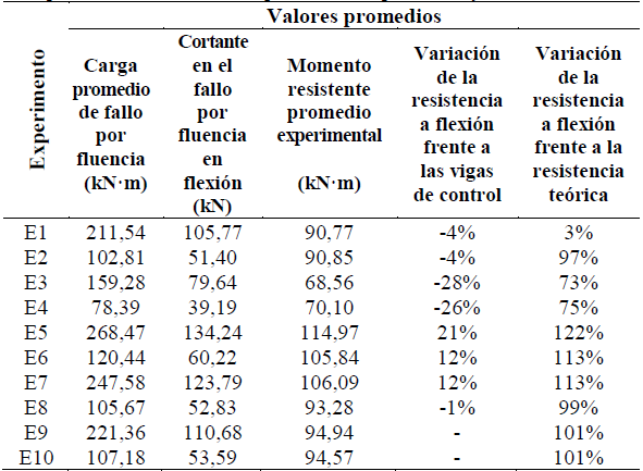 La Tabla 5 contiene los valores medios experimentales de la carga que provoca el fallo primario por fluencia en flexión y del momento resistente en ese instante, así como la relación entre este último valor y los valores del momento resistente de las vigas de control.