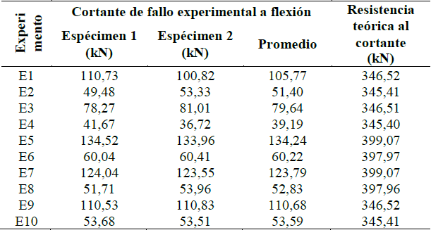 Los resultados de la Tabla 6 indican que la resistencia a cortante teórica es considerablemente superior a la experimental de todos los especímenes, pues se trata de una viga sub-reforzada que falla por la fluencia del acero a tracción antes de que alcance la resistencia máxima a cortante.