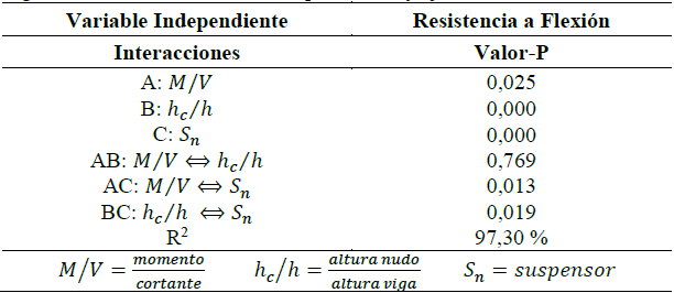 Este apartado contiene el procesamiento estadístico del experimento 2 3 , realizado con la ayuda del software STATGRAPHICS [30]. Se determina la influencia de las tres variables independientes definidas: relación momento/cortante (M/V), relación altura del nudo/altura de la viga (hc/h) y uso de estribos suspensores (Sn), en el momento resistente. La Tabla 7 muestra la significación de las variables independientes en la respuesta momento resistente, por medio de valor del valor-p, así como el ajuste del modelo caracterizado por el coeficiente de determinación múltiple R2.