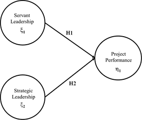 Using as a basis the structural equations modelling, the proposed measurement model starts with a statement conformed by two hypotheses based on the literature referred above; that servant leadership (ξ1) affects performance in projects (ƞ1) (named as Hypothesis 1 H1) and that strategic leadership (ξ2) affects performance in projects (named as Hypothesis 2 H2).