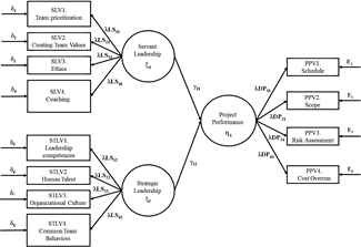 As shown in Fig. 7., the hypotheses construct a model made of latent variables that are not directly measurable, but once the observable variables were determined and analyzed for each latent variable as seen in Tables 2-4, it was possible to propose, theoretically, a measurement model schema regarding the impact of servant and strategic leadership on projects performance (Fig. 8).