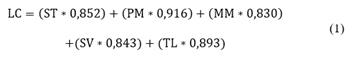 Due to the high correlation between the data collected through the survey, the coefficients that explain each of the five variables studied were calculated, integrating the data into an easier-to-handle equation: Eq (1) and (2). If the survey were applied again to another sample, the data collected could be directly replaced in these equations, obtaining an indicator for each of the factors studied.
