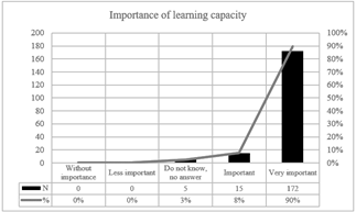 Fig. 2 shows that 90% of those surveyed consider that learning capacity is very important to achieve results in a project. In the comments delivered, the project managers highlight the importance of having experienced human talent to ensure the quality of the results. The question asked to those surveyed was: Do you think that the learning capacity of the work teams is important for the achievement the project results?