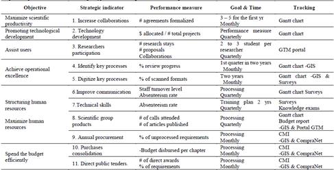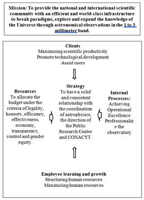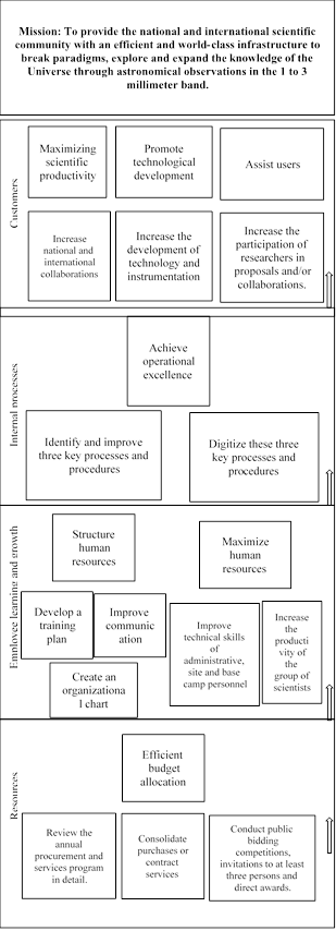 La investigación se llevó a cabo para el Gran Telescopio Milimétrico Alfonso Serrano (LMT), un proyecto conjunto entre los EE. UU. y México. Se creó un Balanced Scorecard (BSC) basado en el enfoque sugerido por Niven en 2008. Se anotaron once indicadores y siete objetivos estratégicos, y se sugirió una medida de desempeño, meta, tipo de monitoreo y tecnología de recolección de datos para cada indicación. Los resultados demostraron que el BSC proporciona un vínculo de causa y efecto en todas las operaciones del observatorio y un marco que se adapta a las particularidades del observatorio.
