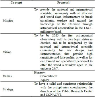 This applied study was done to create a BSC proposal for the Large Millimeter Telescope Alfonso Serrano Astronomical Observatory in a Public Research Center (CPI). Using the method Niven recommended for public and nonprofit organizations in 2008, the objective is to apply the BSC in the aforementioned public research center by establishing the crucial strategic components-mission, values, and vision-as well as a strategic map and performance indicators.