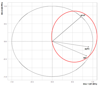 As mentioned above, the variables grouped in the red circle will be used for the design of the leverage indicator, where this new factor gathers 67.86% of the variability from these variables (Fig. 6). The variable endt is suppressed because it has a low correlation with these three variables. Fig. 6 presents the results of the information processing, where it can be observed that the variable apfin is the one with the highest contribution to the component with 40%, besides being the one with the highest correlation represented in the cosine of the angle of 0.817.