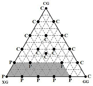 Experimental analysis followed a simplex-lattice mixture design of 3 components (CG, XG, and GG), of order 5 and with central points, resulting in 21 points as shown in Table 1.