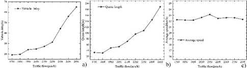 Traffic data including vehicle delay, queue length, average speed, travel time, TF, NPS and ST. We count the observation data of evaluation indicators when TF varied between 1750 and 2550 (in steps of 100). Fig. 2 shows their changes. Vehicle delay and queue length increase quickly with TF, and queue length rises more rapidly. Smaller change range in average speed due to the road speed limit and traffic status. In actual observations it was found that when TF is at a low level, the vehicle speed is essentially equal to the roadway speed limit, vehicle delay and queue length values are small, and they have little variation, but when TF is greater than 1700, the vehicle delay and queue length values increase rapidly, and average speed maintained at low level.