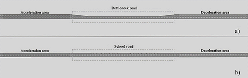 The school and bottleneck roads are both similar and different in traffic characteristics. This is because One of the lanes in the school road is occupied due to on-street parking, but it still has capacity due to the short parking time. In this study, the bottleneck road is defined as a roadway with a reduced number of lanes in the urban scenario. Currently, few studies have compared the traffic characteristics between them. But extensive research has been carried out on bottleneck roads. Traffic efficiently of the bottleneck road is seriously affected by traffic flow [12]. As traffic flow increase, the evaluation indicators become terrible, e.g., the queue length increases and average vehicle speed decreases [13,14]. Traffic simulation is often used to develop further analysis of bottleneck road traffic status [15]. The bottleneck road traffic flow indicators can occur significant critical eigenvalues. This always appears when during traffic state transitions [16].