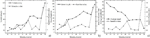 Fig. 8 shows the change in evaluation indicators as ST increases. Inflection points in rate of change for the evaluation indicators occurred at 52 and 64. Overall, vehicle delay and queue length continue to increase, and average speed is reduced. When the ST varies from 10 to 52, the indicators change greatly, and the sensitivity averages for vehicle delay, queue length, and average speed are 0.98, 1.12, and 0.29, respectively. The indicators tend to stabilize at ST values between 52 and 64, with their sensitivity averages of 0.02, 0.78, and 0.04, respectively. When the ST is greater than 64, the indicators show renewed trends.